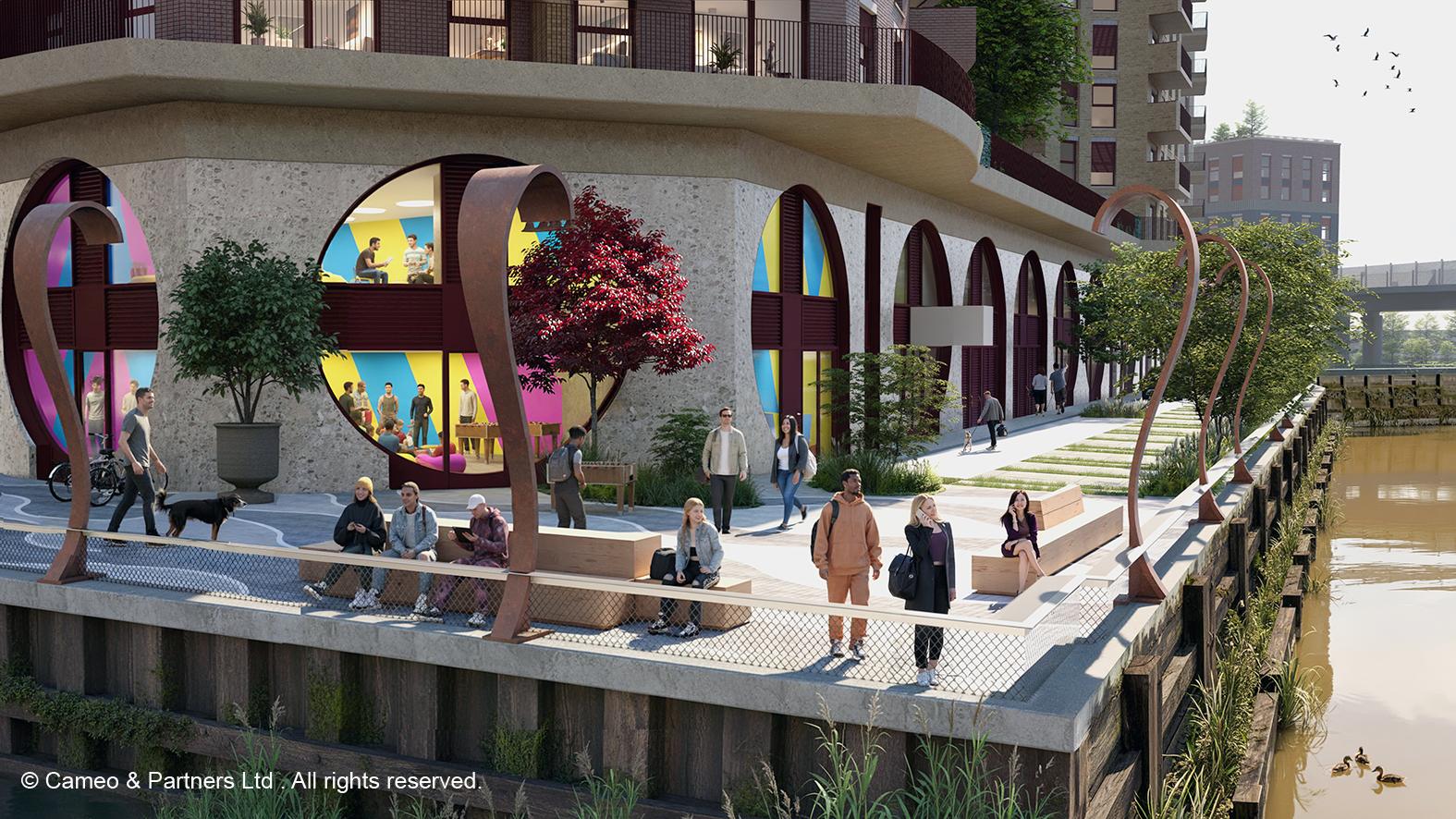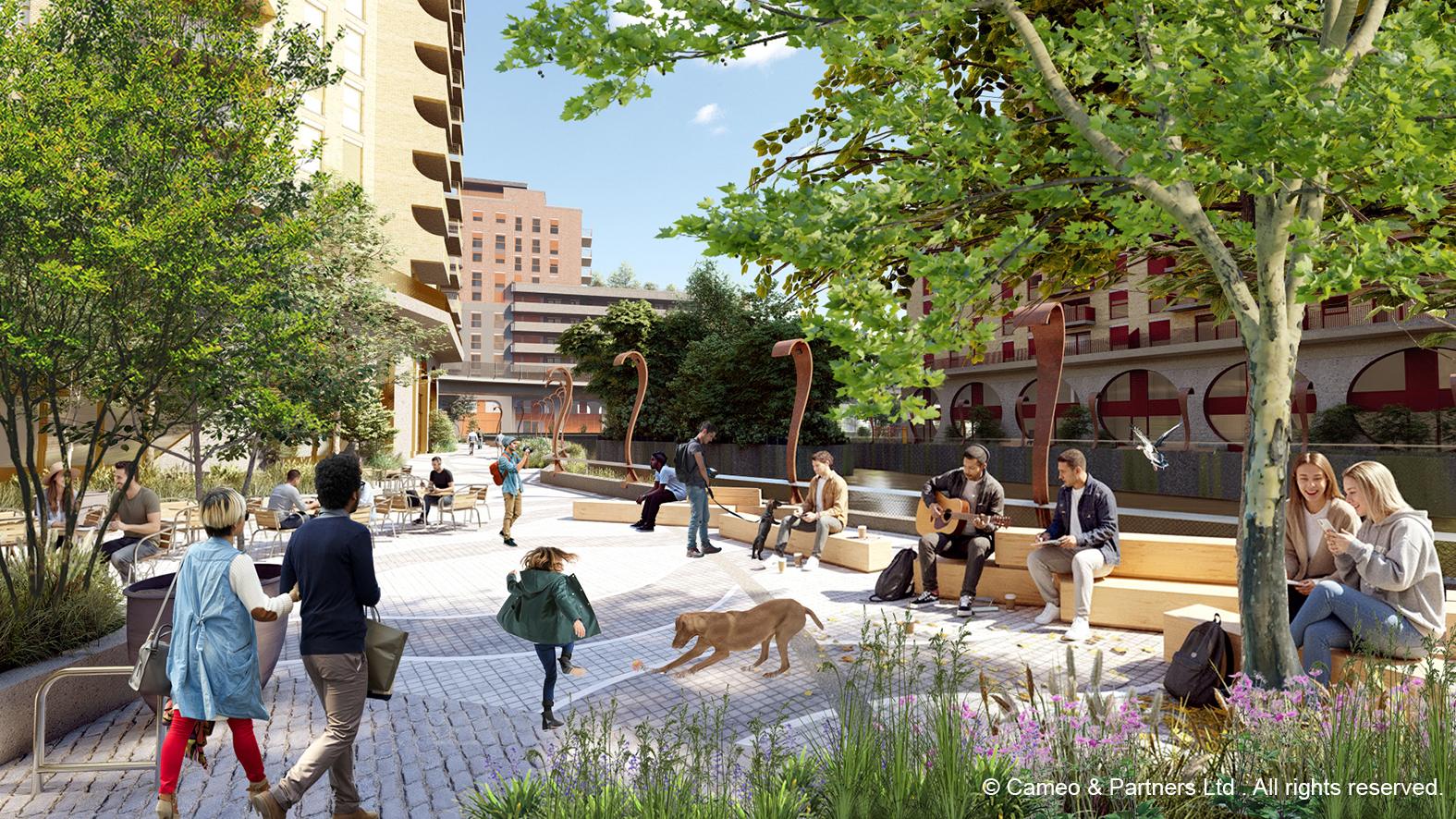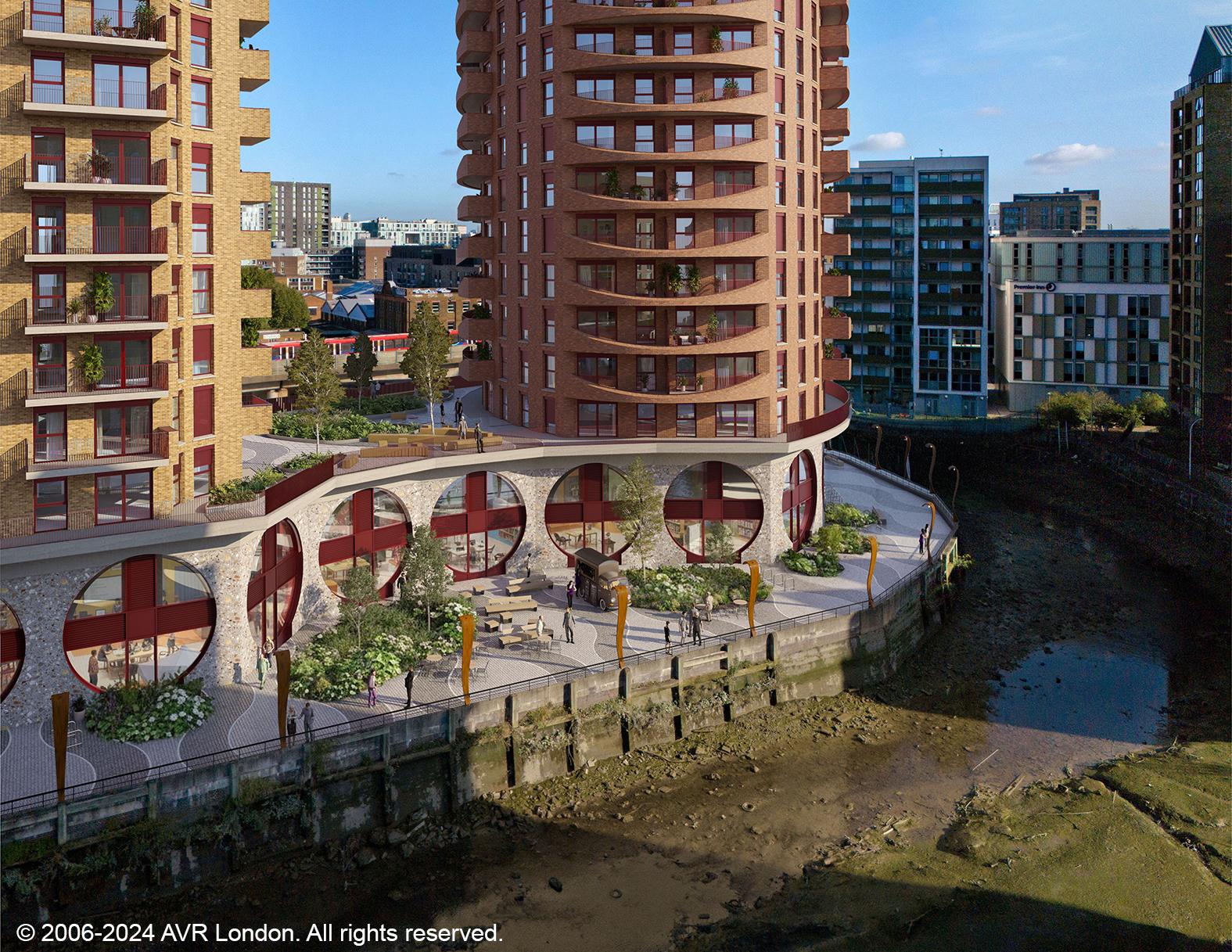 Deptford Reach is being crafted as a bold, multi-level landscape shaped by the tidal character of the creek itself. At its heart are calm, green spaces with lush planting, shaded seating, and flexible areas for gathering and pause. These flow upward into podium terraces designed for play, relaxation, and social connection. More than 200 new trees define and enrich the streetscape, while the DLR line above brings a distinctive, urban rhythm that anchors the place’s identity.