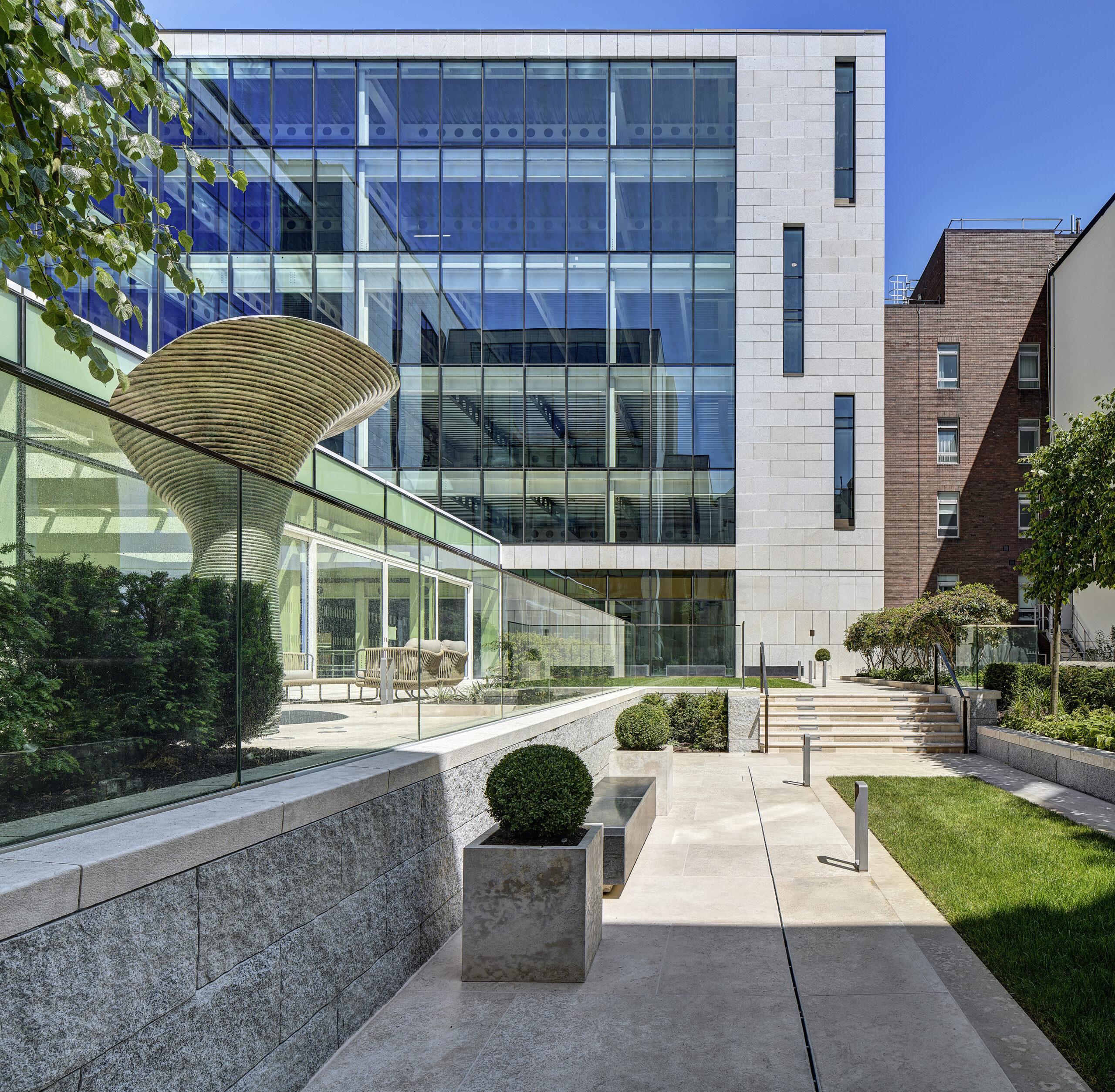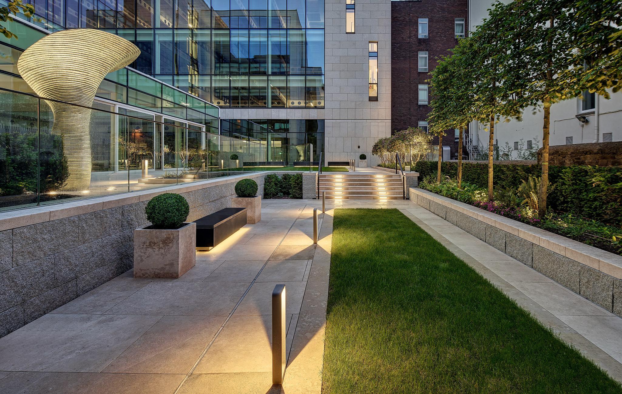 The southernly aspect of the garden is complemented by an elegant lawn and sunken garden, which offers the occupants of the building a peaceful space removed from the hustle and bustle of the city. This contemporary garden successfully embraces Georgian influences, through a high-quality limestone material palette and fine detailing. A sculptural art piece forms a focal point on the upper terrace.